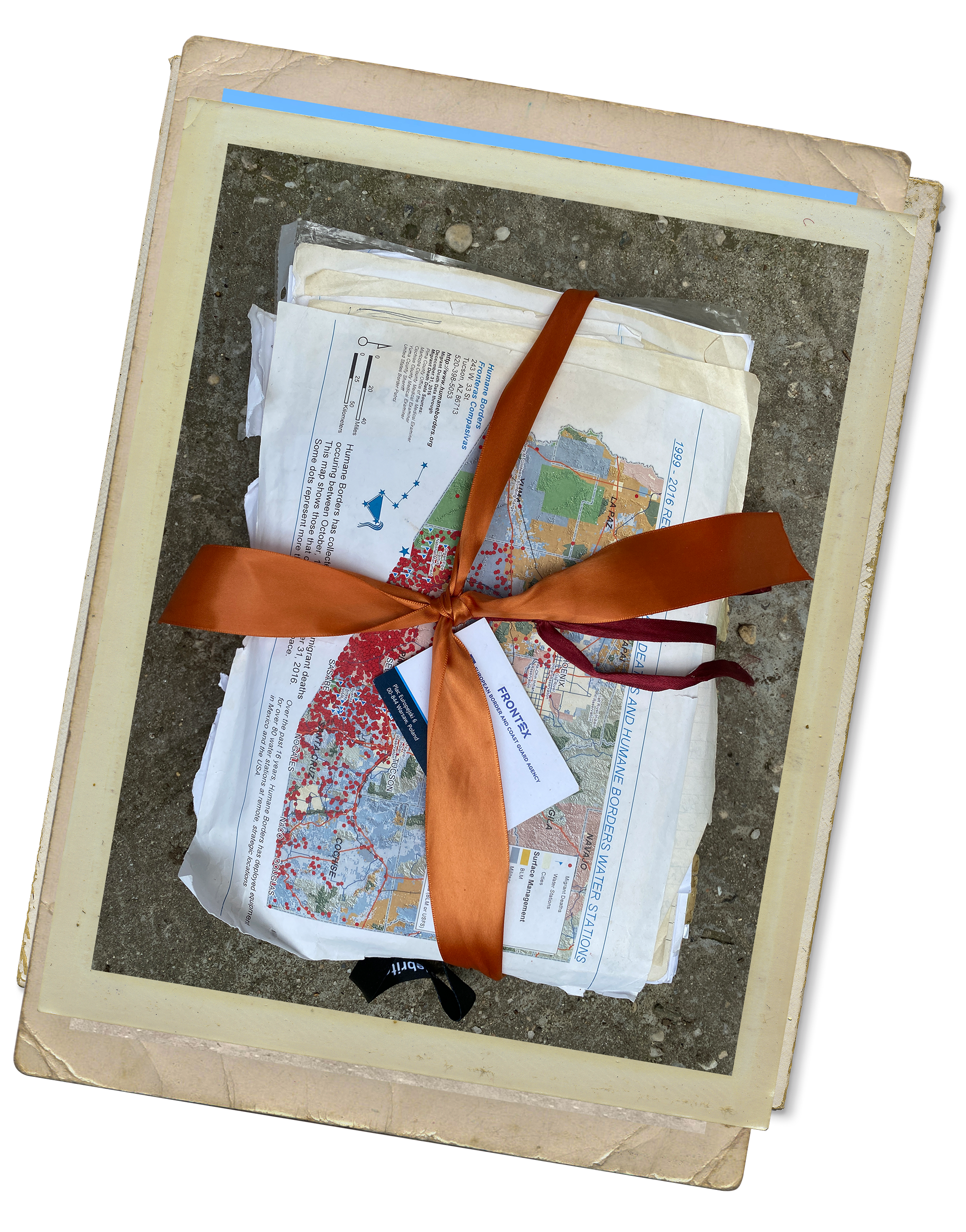 Over the years, people have been incredibly generous in sharing their stories with me, often in the most difficult of times. Since 2018 I have also been archiving audio, visual, and written material, both as a way to remember and to stitch together the complex tapestry of human movement. A large pile of dog-eared papers and coffee-stained notebooks has traveled the world with me, from Greece, to Mexico, to Kenya, to Palestine, with a small coffee cup full of ash from the Moria refugee camp and various other treasures sitting on my desk - a daily reminder of the material reality of this work.